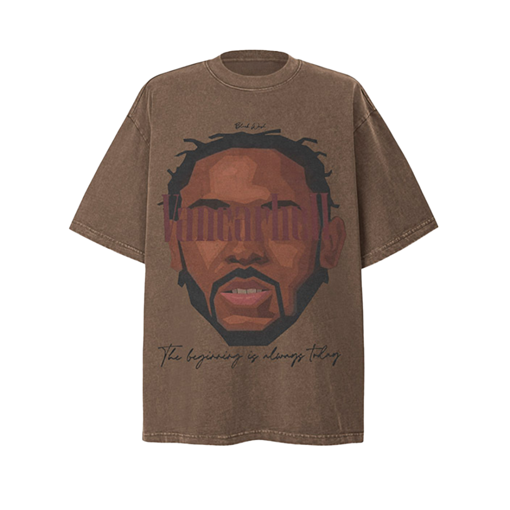 This T-shirt features a bold graphic design with an artistic portrait of a man, and the text "The beginning is always today" underneath, creating a unique and motivational statement. The T-shirt is available in two colors: a dark greenish gray and a light brown, both with a washed effect for a vintage feel