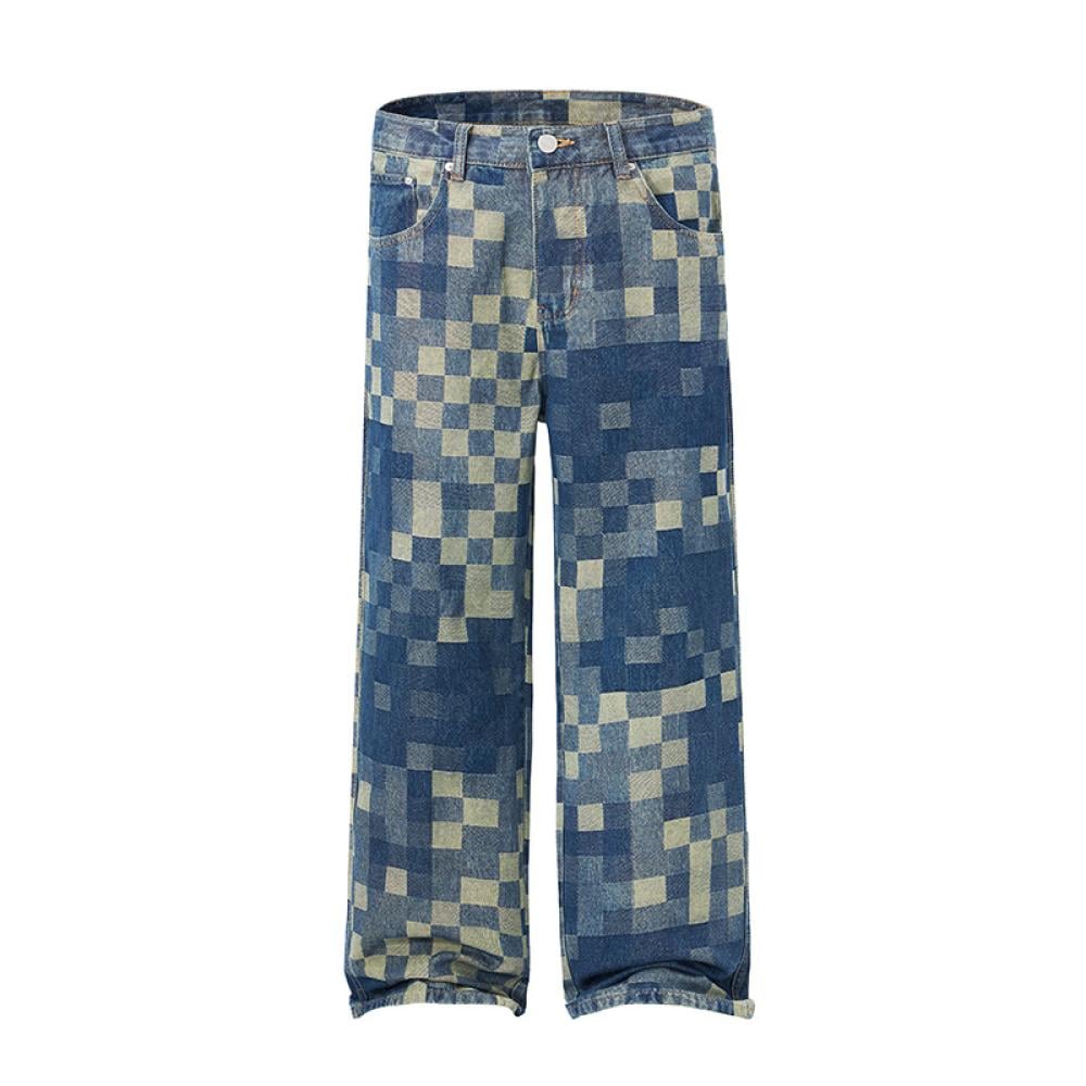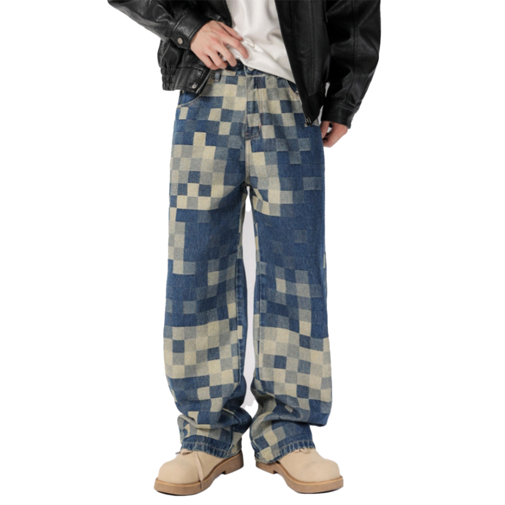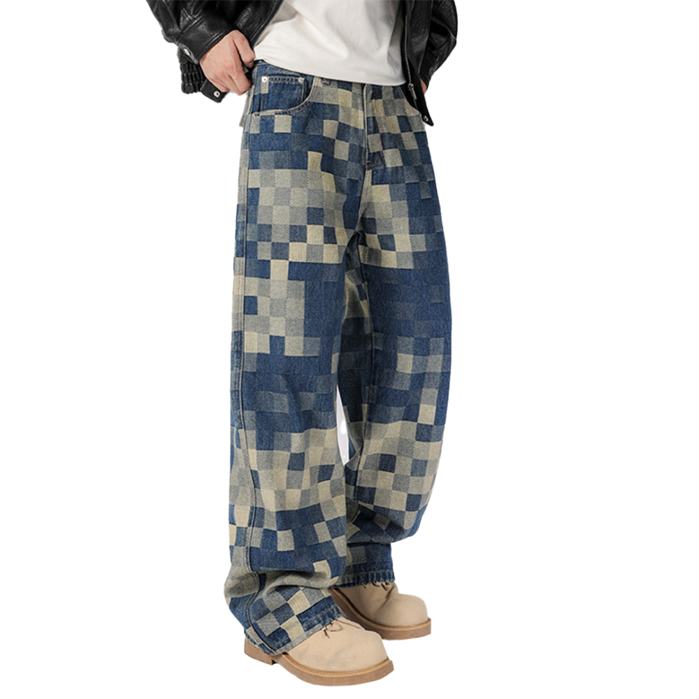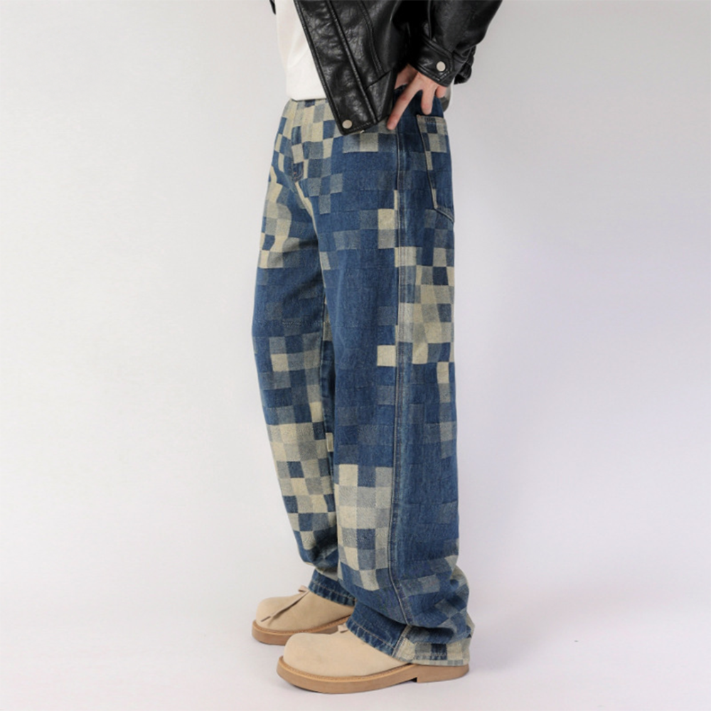 These stylish and trendy patchwork denim jeans feature a unique pixelated design, offering a modern twist on classic denim. Crafted with high-quality denim fabric, the jeans boast a comfortable and loose fit, perfect for both casual outings and streetwear looks. The bold patchwork pattern stands out, giving it an edgy, yet fashionable appeal. The design incorporates contrasting shades of blue and beige, making these jeans versatile enough to pair with a wide range of tops. With their relaxed cut and statement design, these jeans are a must-have for anyone looking to make a bold fashion statement
