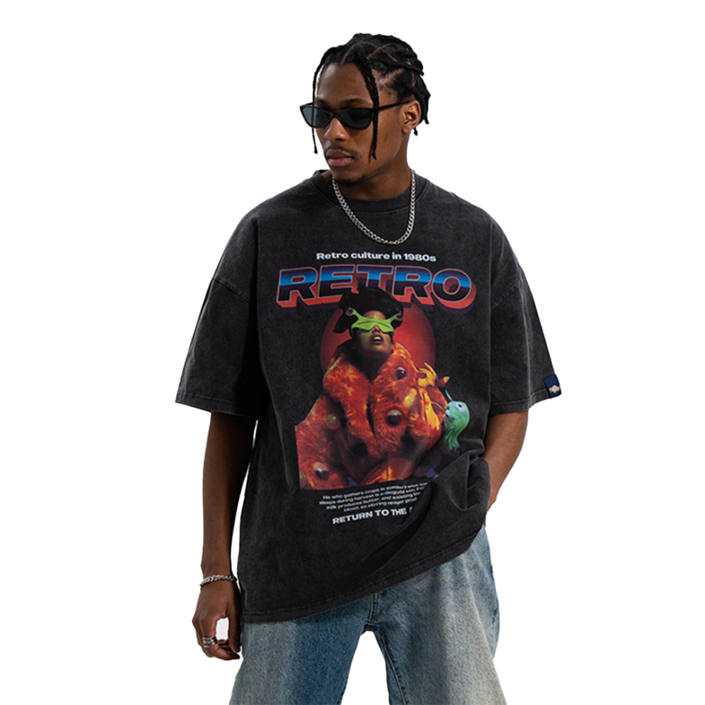 This retro-inspired t-shirt brings back the 1980s vibe with bold, vintage graphics and typography. It features the word "RETRO" in vibrant colors along with an image that captures the essence of 1980s culture. The shirt is made from soft, breathable cotton for maximum comfort and features a loose, relaxed fit. Perfect for a laid-back, fashionable look, it channels nostalgia while offering a modern twist