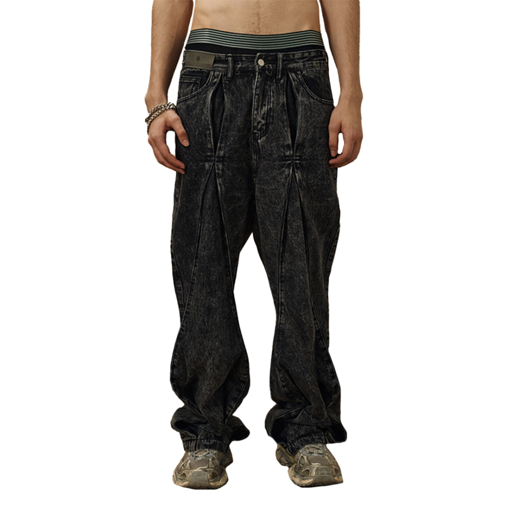 A statement-making wide-leg denim pants with a vintage acid-wash finish, designed for those who embrace bold and edgy streetwear aesthetics. Featuring distinctive pleated details along the front for added texture and depth. The loose silhouette ensures comfort and effortless styling, making it a versatile addition to any modern wardrobe. The high-quality denim fabric provides durability while maintaining a relaxed, breathable fit