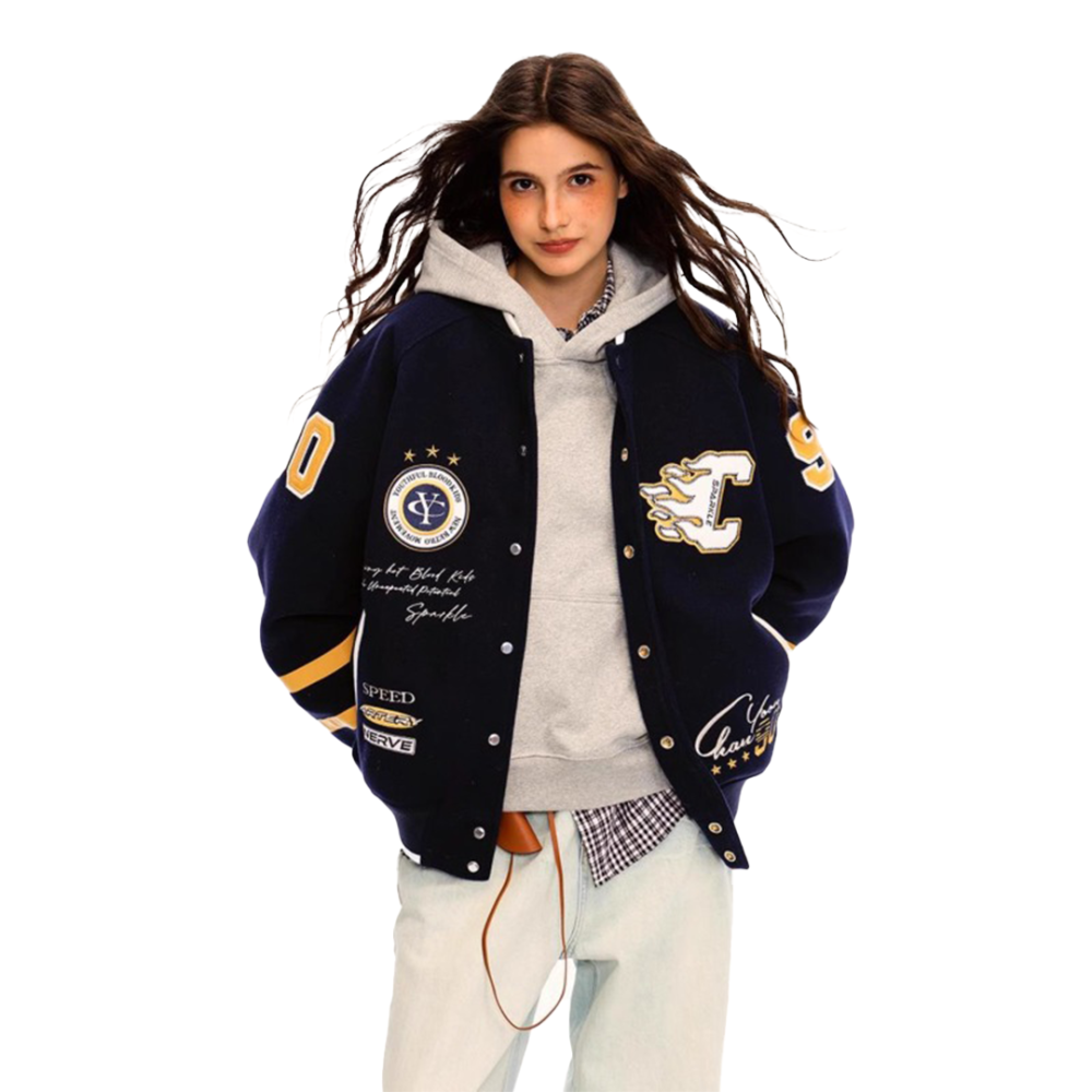 Step up your streetwear game with this classic varsity jacket, a perfect blend of retro aesthetics and modern street style. Designed with high-quality fabric , this piece is both stylish and warm. Featuring embroidered patches, bold typography, and sporty stripes, it embodies the spirit of collegiate fashion while maintaining a contemporary edge. The oversized fit makes it ideal for layering over hoodies or sweatshirts for an effortlessly cool look