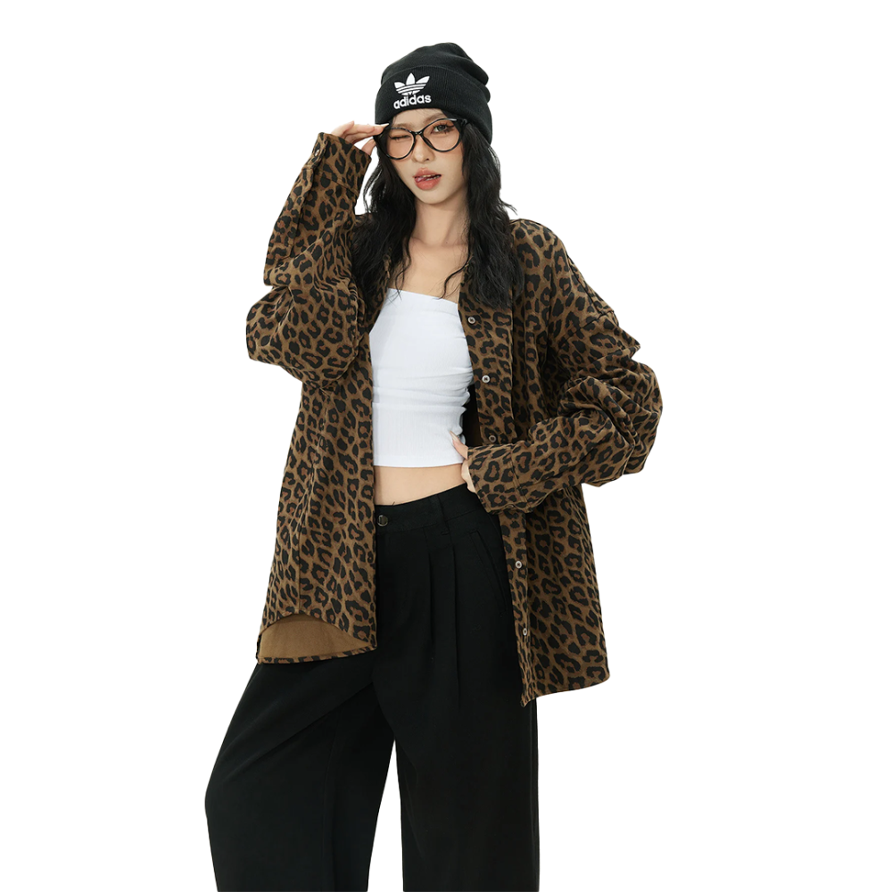 Unleash your bold side with this statement leopard-print shirt. Designed for those who love to stand out, this oversized shirt blends effortless confidence with contemporary style. Crafted from soft, breathable fabric, it offers a relaxed fit for all-day comfort. Whether worn as a standalone piece or layered over a simple top, this shirt is perfect for adding an edgy touch to your wardrobe