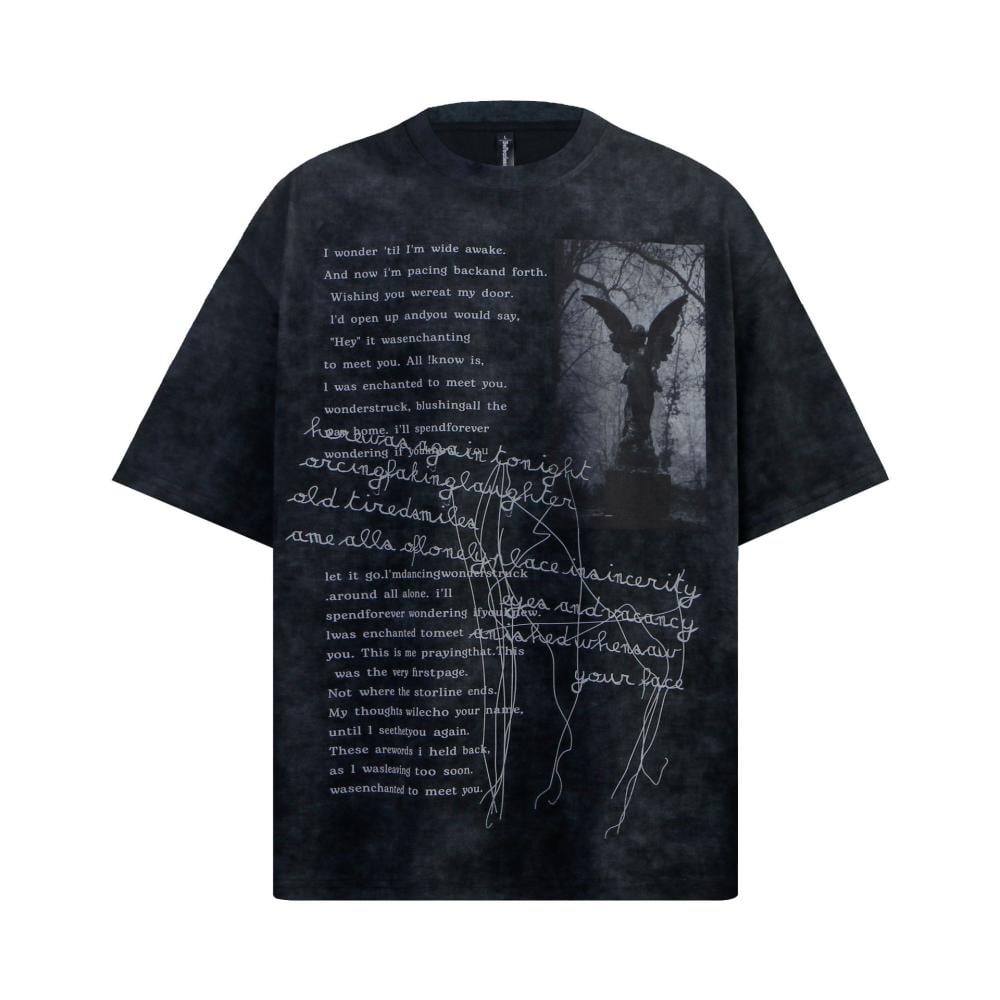 This artistic black t-shirt features a captivating design with poetic text and a symbolic image of an angel. The monochromatic palette adds depth to the detailed illustration, while the intricate text expresses introspection and emotional vulnerability. The oversized fit ensures comfort while maintaining a high-fashion streetwear appeal. This shirt effortlessly blends art and fashion, making it a standout piece for anyone seeking a unique and expressive style