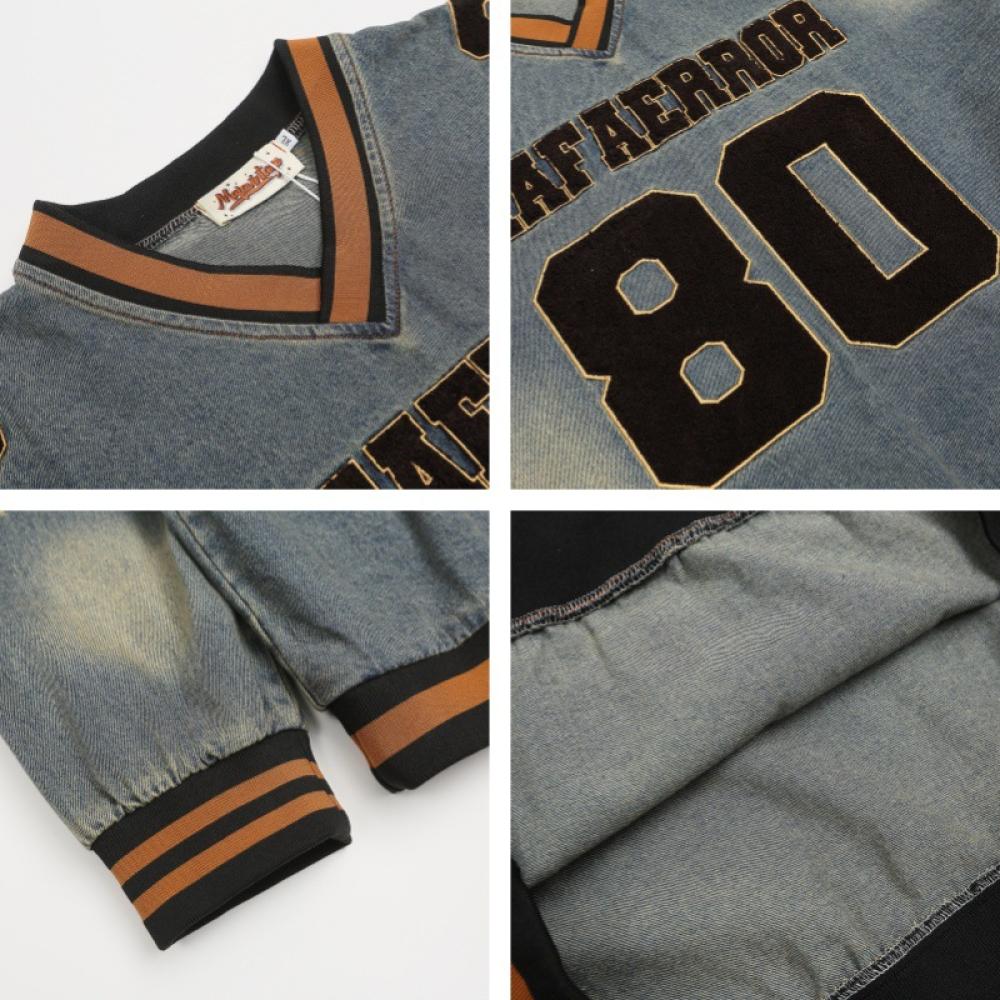 This premium vintage-inspired denim sports jersey combines classic design with modern streetwear vibes. The front boldly displays the number "80" creating a strong urban aesthetic. The contrasting black stars on the sleeves and the distinct distressed denim finish add an edgy touch, elevating the overall look. Crafted from high-quality denim fabric, the jersey offers both style and comfort with its relaxed fit and durable material. Ideal for casual wear or street fashion, this piece brings a unique touch to your wardrobe
