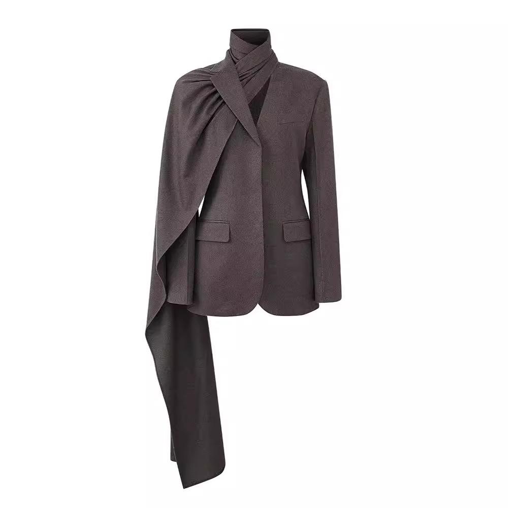 An elegant reinterpretation of classic tailoring. This women’s suit jacket blends sophistication with modern artistry, featuring a fluid scarf gracefully attached at the collar for a refined layered effect. Designed with a structured silhouette and soft drape, it captures timeless femininity with a contemporary edge , perfect for statement styling or elevated daily wear