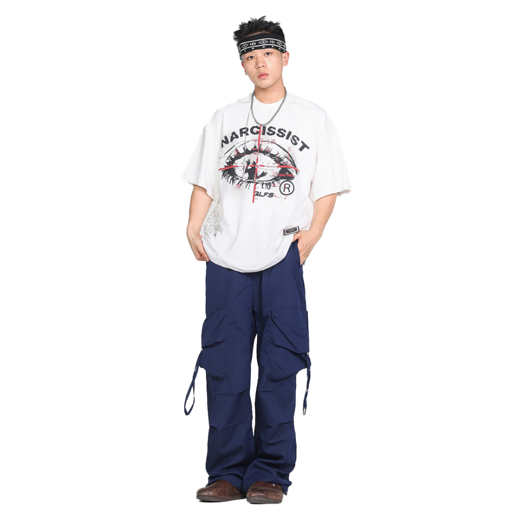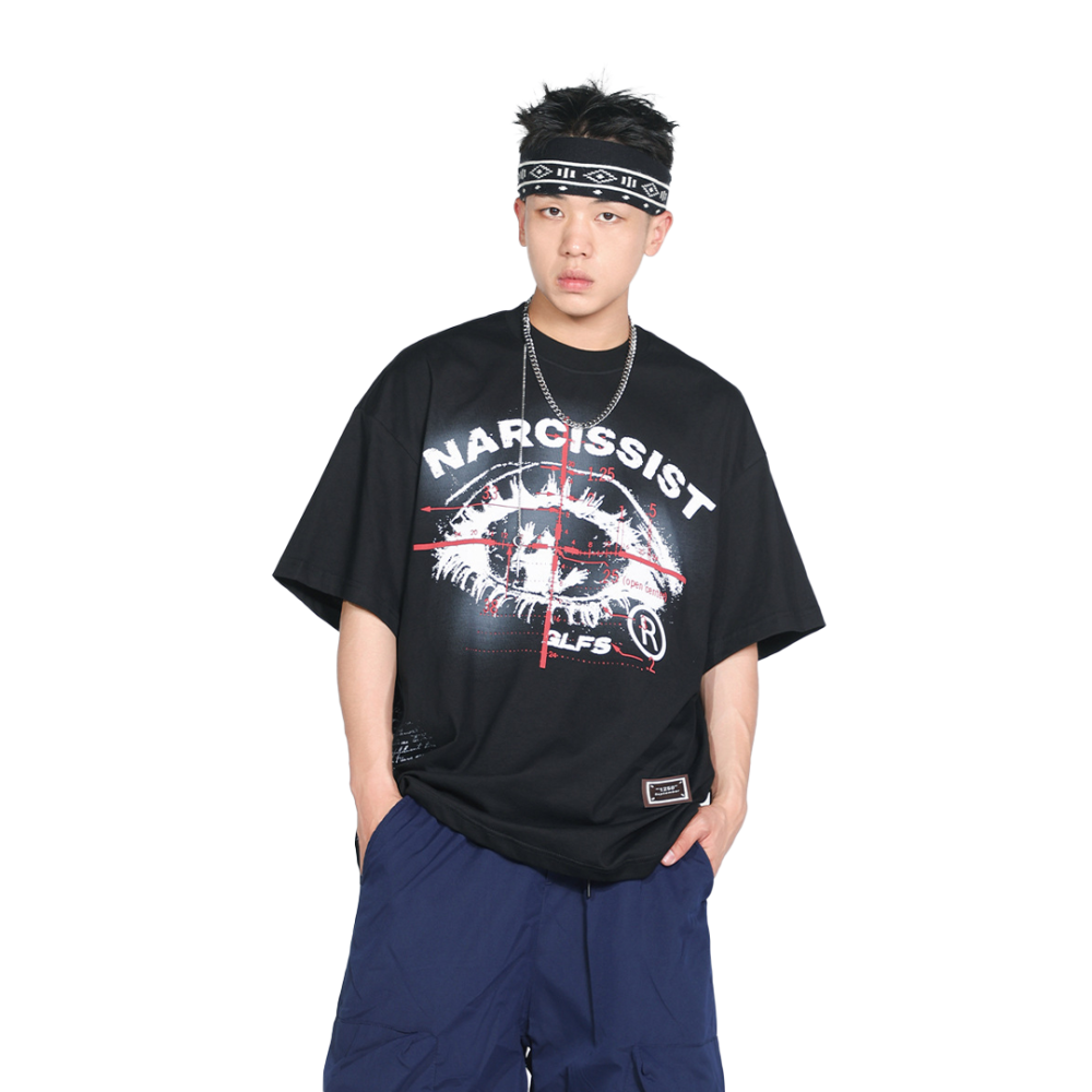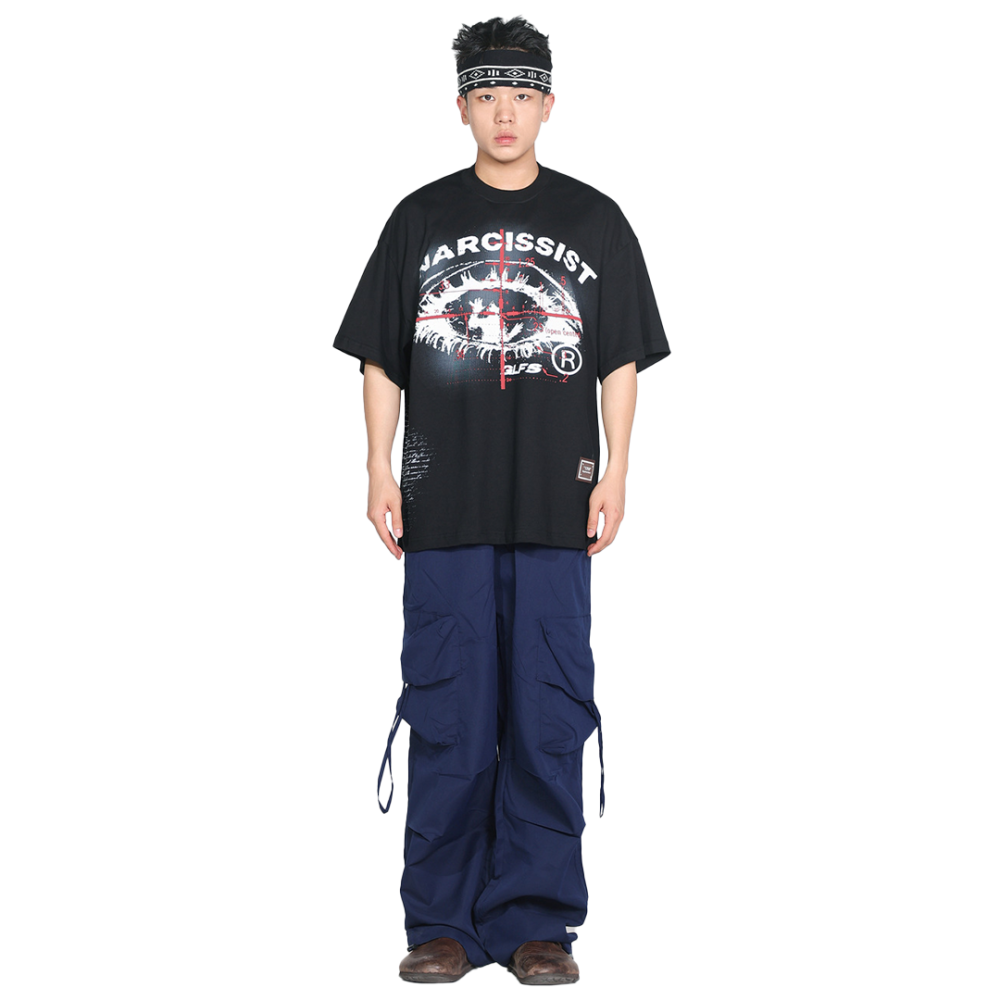 This "Narcissist" t-shirt features a bold graphic design with an eye at the center of the chest, symbolizing self-reflection and boldness. The "Narcissist" text adds an edgy touch to the piece, while the unique crosshair-like design with measurements adds a distinct artistic style. The shirt is made of high-quality cotton, ensuring comfort and durability. It’s available in two colorways—black and white—giving you options for a versatile look. Ideal for making a statement, this t-shirt is perfect for streetwear lovers